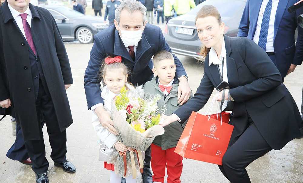 Öğrenciler, Yıldırım ve Bakan Özer'e çiçek verdi.