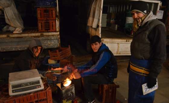 Çorlu’da vatandaşlar soğuk hava nedeniyle semt pazarlarına alışveriş yapmaya dahi çıkmazken pazarcı esnafları açılmayan kapalı pazaryerinin hemen yanı başında açık alandaki tezgahlarının başında ateş yakarak müşteri beklediler.